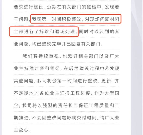“近期在有关部门的抽检中,发现若干问题,我司第一时间积极整改,对现场问题材料全部进行了拆除和退场处理,同时对涉及到的其他问题,均已整改完毕并已回复有关部门。”公司方面表示,将保证工程质量和工期,不会因整改问题影响交付时间。