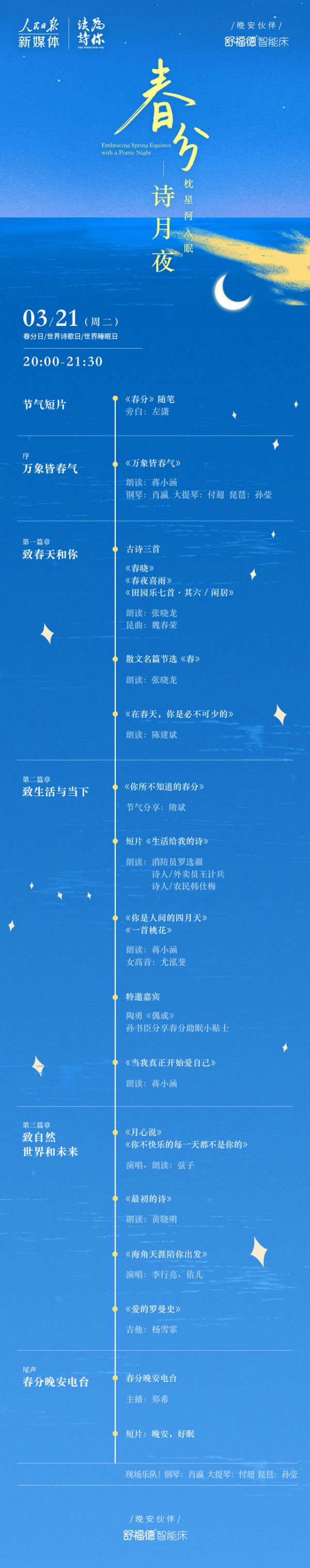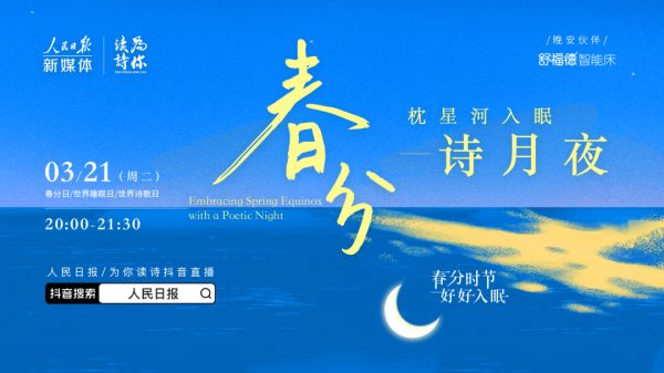 今年春分恰与世界睡眠日、世界诗歌日为同一天。今晚20:00,由人民日报新媒体、为你读诗联合推出,晚安伙伴舒福德智能床特约支持的大型节气文化直播节目《春分诗月夜》即将开播。节目将在人民日报抖音直播间、人民日报客户端、人民日报视频客户端视界和为你读诗新媒体平台同步播出。