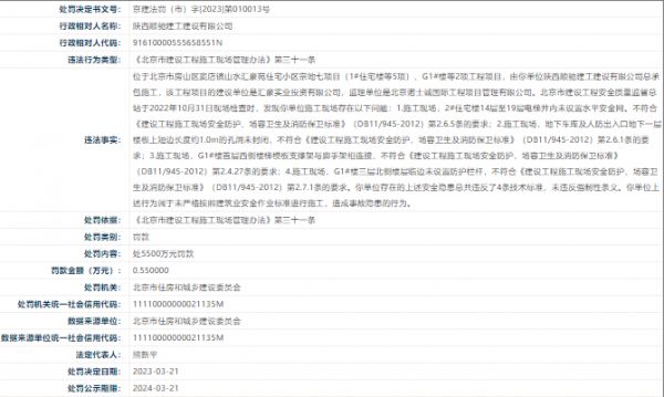 陕西顺驰建工施工不规范被处罚 涉及项目为北京山水汇豪苑