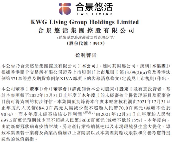 中国网财经3月29日讯 合景悠活昨日发布盈利预警称,公司2022年预期录得利润大幅减少至不超过7000万元,减幅较2021年的6.84亿元相比不低于90%,预期核心净利润不超过5.8亿元,减幅不低于15%。