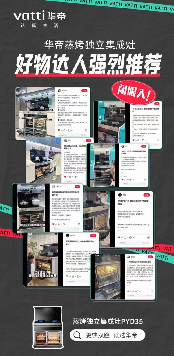 线下活动大动作频频的同时,善于借助新兴媒体力量放大品牌声量的华帝,以每周三一场的高频次直播,以及“达人探店,全域种草”,再次将华帝集成灶渠道大网有效串联,“以点带面”最大化激活品牌势能,最终实现线上与线下联动爆破,流量、销量与声量的多赢。