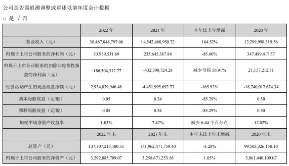 中国网财经4月14日讯 中交地产(000736)日前发布了2022年年报。报告期内公司实现营业收入384.67亿元,同比增长164.52%;归属于上市公司的净利润为3393.95万元,同比下降85.6%,这是中交地产该指标连续第四年出现下滑,2019-2021年的净利下滑幅度分别为33.04%、35.92%和32.19%。
