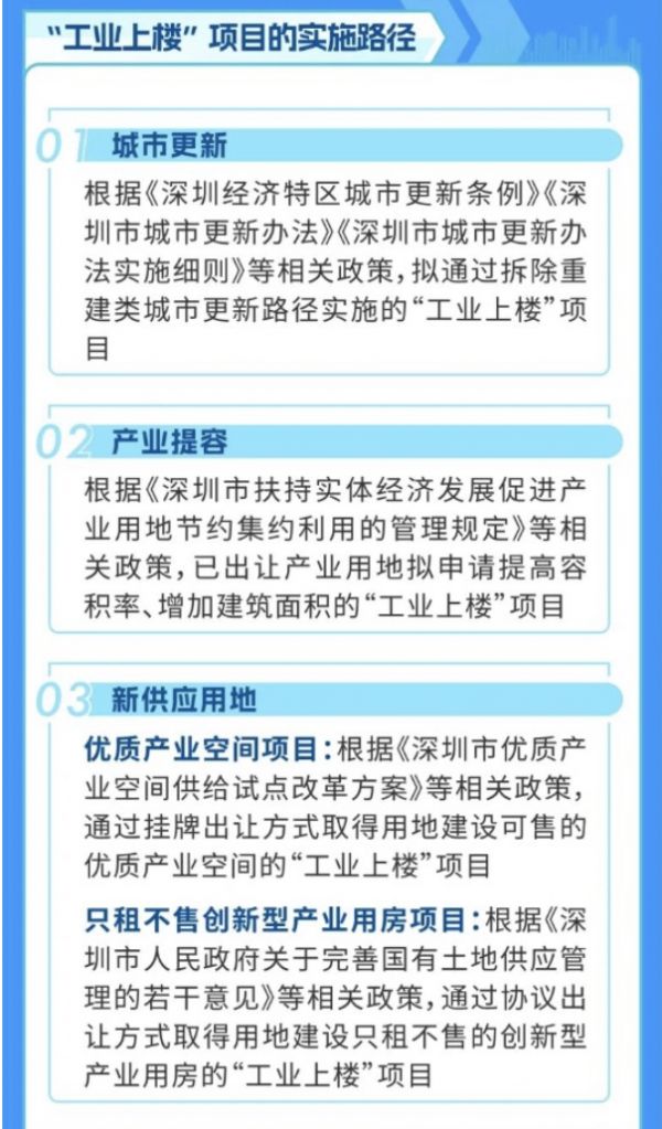 “具体而言,涉及拟通过拆除重建类城市更新路径实施的‘工业上楼’项目;已出让产业用地拟申请提高容积率、增加建筑面积的‘工业上楼’项目;新供应用地途径下,通过挂牌出让方式取得用地建设可售的优质产业空间的‘工业上楼’项目,以及通过协议出让方式取得用地建设只租不售的创新型产业用房的‘工业上楼’项目。”