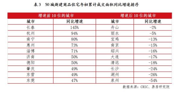 从1-4月整体来看,通过对50个重点城市新建商品住宅成交面积同比增速进行排序,其中,楼市交易行情表现较好的10个城市分别为长春、杭州、南宁、惠州、淄博、济南、德阳、肇庆、东营和东莞,同比增速均接近或超过了50%。