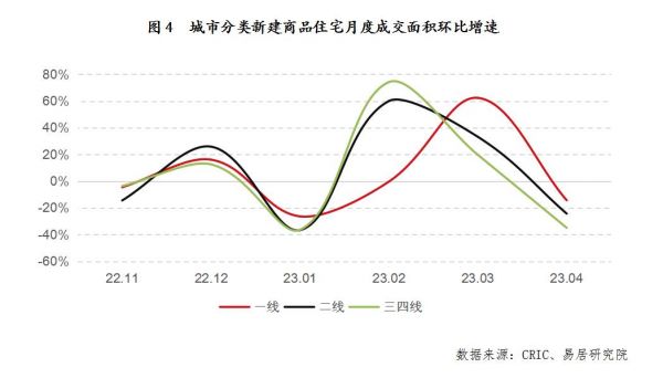 通过对全国50个重点城市按一、二、三四线城市进行分类,数据显示,今年4月份,一、二、三四线城市新建商品住宅成交面积分别为277、1048和571万平方米,环比增速分别为-14%、-24%和-35%。三类城市均出现了环比下降态势,说明3月份冲高后普遍回落。