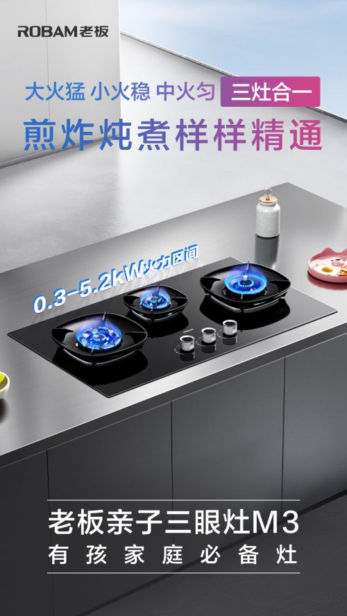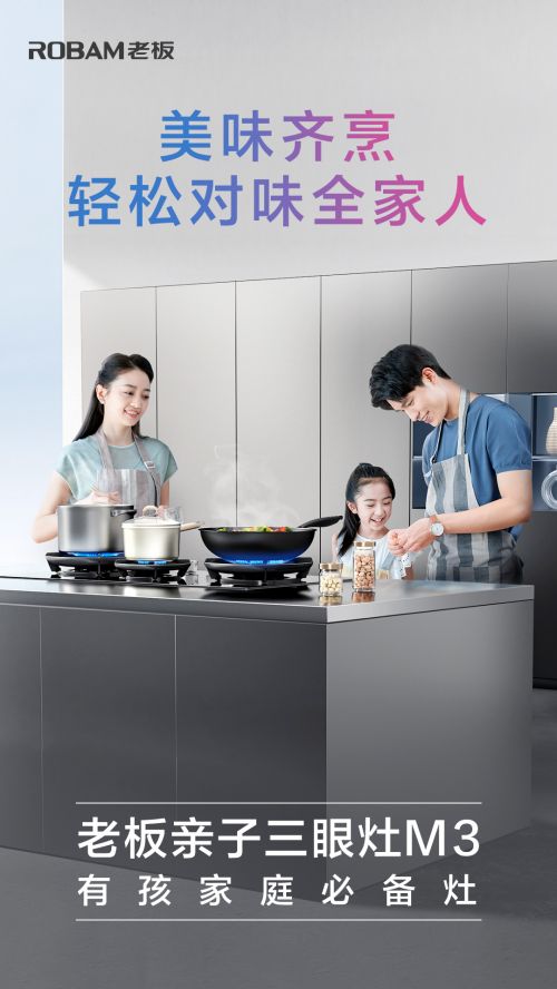 老板电器聚焦中式烹饪44年,一直坚定的站在用户角度,洞察需求,降低烹饪门槛,让用户喜欢烹饪、享受烹饪。老板电器发布的老板亲子三眼灶M3 ,正是基于家庭用户需求打造,为多口之家带来惊喜。相信老板电器未来会继续以创新科技创造中国新厨房,引领人类烹饪生活方式变革,创造人类对厨房生活的一切美好向往。
