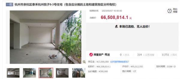 5月7日上午10时,备受关注的泰禾杭州院子8-3号住宅因无人出价而流拍。该房源建筑面积649.49平方米,评估价9501万元,起拍价6651万元,相当于折价约30%。