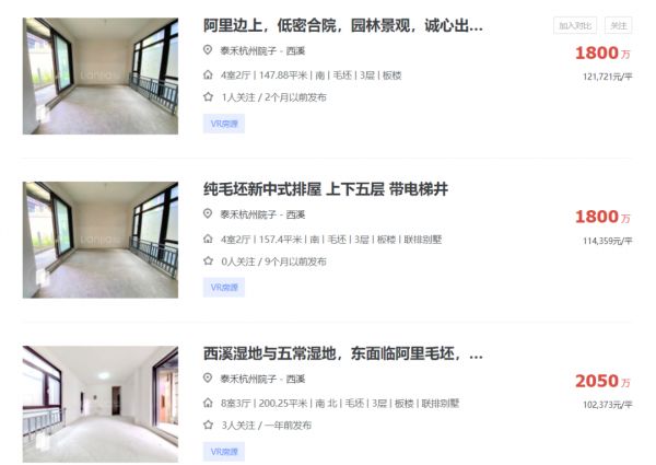 据链家数据,目前泰禾杭州院子业主普遍挂牌价在8万-12万元/平方米不等,如一套4室2厅157.4平方米房源,挂牌价1800万元,折合单价11.4万元/平方米。