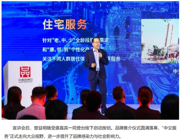 5月12日,据中交服务集团官微,在5月10日举行的2023年度中国品牌日活动中,“中交服务”品牌首次推介亮相,总经理曾益明进行品牌宣讲。