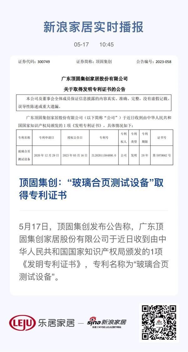 5月17日,顶固集创发布公告称,广东顶固集创家居股份有限公司于近日收到由中华人民共和国国家知识产权局颁发的1项《发明专利证书》,专利名称为“玻璃合页测试设备”。