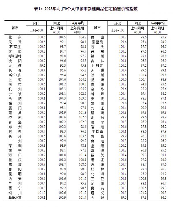 中国网财经5月17日讯 据国家统计局网站消息,国家统计局发布2023年4月份70个大中城市商品住宅销售价格变动情况。数据显示,4月份70个大中城市中有62城新建商品住宅销售价格环比上涨,银川涨幅1.0%领涨。
