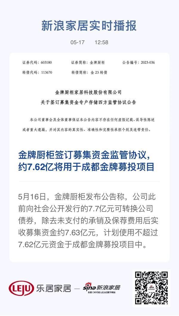 5月16日,金牌厨柜发布公告称,公司此前向社会公开发行的7.7亿元可转换公司债券,除去未支付的承销及保荐费用后实收募集资金约7.63亿元,计划使用不超过7.62亿元资金于成都金牌募投项目中。