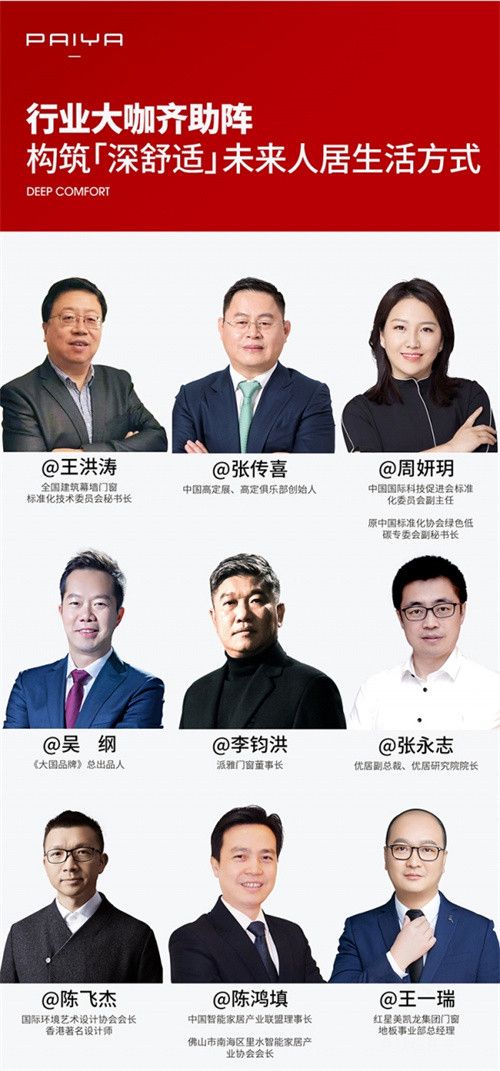 如在《共筑「深舒适」美好人居》论坛环节中,全国建筑幕墙门窗标准化技术委员秘书长王洪涛,中国高定展、高定俱乐部创始人张传喜,优居副总裁、优居研究院院长张永志,香港著名设计师陈飞杰等多位行业权威专家与派雅门窗副总经理吴健、品牌用户代表将一同寻找行业实现高端转型升级的新突破口,探索「深舒适」未来人居生活方式。