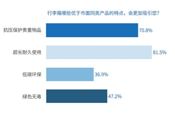 与此同时,受益于休闲度假和商旅市场的高速发展,也伴随着消费观念的升级,如今的消费者对箱包类产品的需求除了品质外,在舒适安全、绿色环保等方面也都有了更高的要求。正如在这次调研中,分别有47.2%和36.9%的受访者希望箱包产品能具有“绿色无毒”和“低碳环保”的特点。