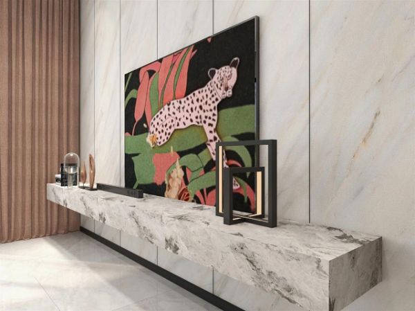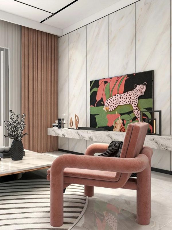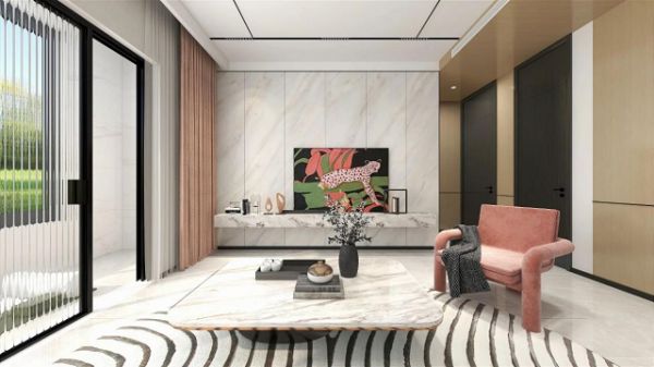 墙面、顶面与门框,黑色金属线条气质满满,打破大面积背景色的单调,也勾勒出整个空间的简约现代感。 客厅区域,「暖玉」系列背景与茶几的大理石纹相呼应,色彩上保持和谐统一,温润暖色,温馨理性的现代轻奢气质,营造梦幻家居感。