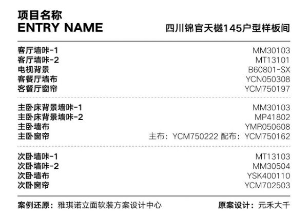 雅琪诺立面软装坚持以原创设计引领时尚潮流,专注软装整体解决方案,不断刷新自己,赋予家居空间新的生命活力。对于软装的色彩、设计和搭配,雅琪诺认为这几大关键要素需紧密关联,依托创意设计研发基地和丰富的产品资源支持,满足客户需求。今天给大家分享的这套由「雅琪诺立面软装方案设计中心」还原的锦官天樾145户型样板间,用10多种色彩,将空间打造得既和谐,又具有高级感。