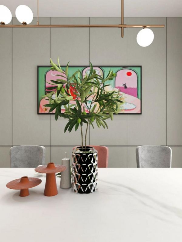 餐厅区域,多色复古油画装点用餐氛围,散发艺术与文艺气息,满足精致仪式感。绒面餐椅肉眼可见的舒适,让感官沉浸在柔软世界里。雅灰与脏橘双色相间排列,横纵向都是对称的设计,氛围与美感统统安排。