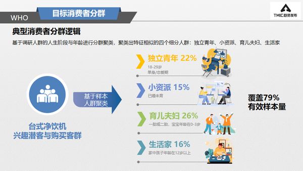 此前天猫品牌日&TMIC趋势发布的《台式净饮水机白皮书》显示,当前净饮机的主销群体为独立青年、小资派、育儿夫妇、生活家四大类。不同群体对功能也有所偏好,如独立青年更关注急速加热,小资派对水质检测关注度高,育儿夫妇更关注儿童锁等产品安全,生活家关注自动清洗、静音等更高品质需求。