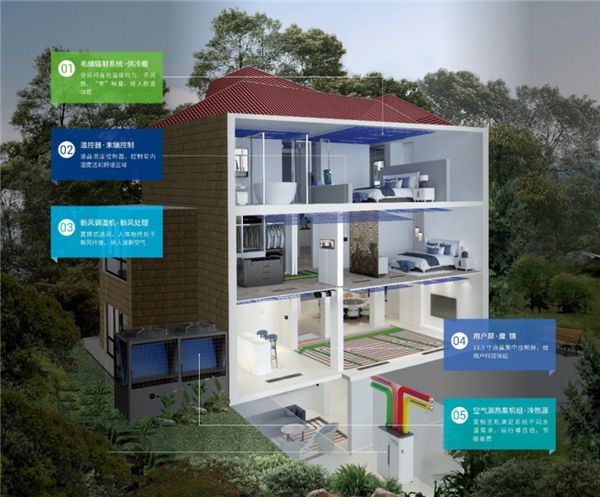 这套科技系统的组成与常规空调有所不同,包括冷热源系统和空调末端系统。冷热源系统为夏季制冷提供高温冷源(传统制冷供回水温度为7/12℃,高温冷源供回水温度为16/19℃),为冬季供暖提供低温热源(传统制热供回水温度为45/40℃,低温热源供回水温度为35/30℃),相比于传统空调而言,冷热源系统能够降低能耗,系统运行更加节能。空调末端系统采用毛细辐射空调+新风系统,可以分别调节室内温度和湿度。