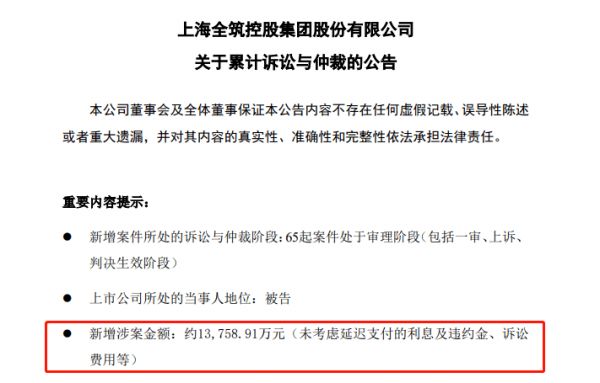 鉴于公司因恒大问题导致的流动性在未根本改善的前提下,未能偿付部分供应商款项,以及部分票据持有人行使追索权,共同导致公司被诉案件进一步增加。全筑股份根据近期案件梳理结果,自前次(2023年4月29日)披露的累计诉讼与仲裁公告至今,公司及控股子公司累计诉讼与仲裁新增金额合计约13,758.91万元,新增案件中65起案件处于审理阶段(包括一审、上诉、判决生效阶段)。