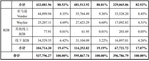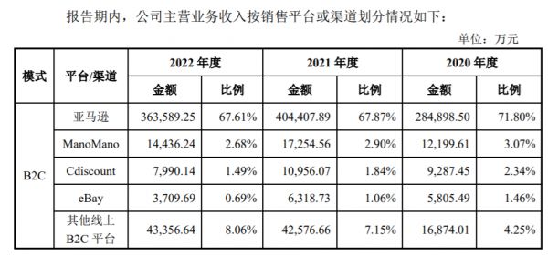 招股书显示,2020年、2021年和2022年,亚马逊平台分别贡献了致欧科技B2C销售额的71.80%、67.87%和67.61%;在B2B模式中,亚马逊Vendor为其提供的销售收入占比分别为8.45%、9.36%和8.35%。