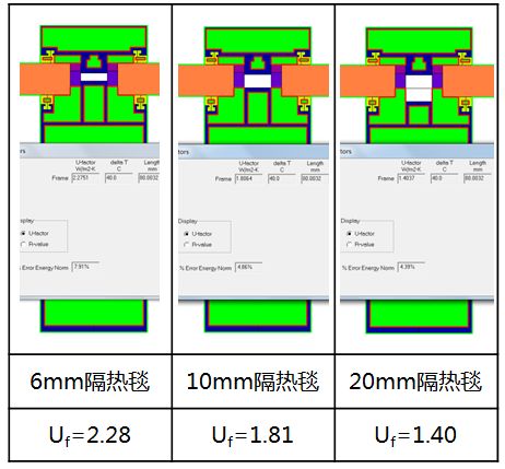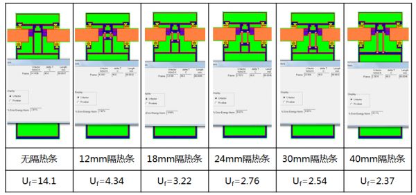 1) 聚酰胺尼龙隔热条的应用与否对于框的U值有着至关重要的影响,相比非断热的框,12mm隔热条可以大幅降低框的U值达69%,性价比极高,这就很好解释了自2005年国家颁布《公共建筑节能设计规范》后,隔热条的应用被迅速和广泛地普及开来。
