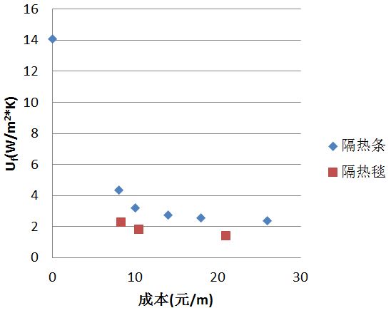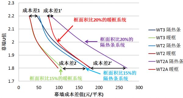 3) 比较有机隔热系统和暖框系统的性价比,当成本相同时,后者框的U值比前者平均降低45%;当框的U值相同时,后者的成本仅为前者的1/3。