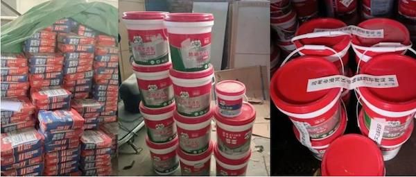 深圳罗湖查扣假冒瓷砖胶TTBII 225包。