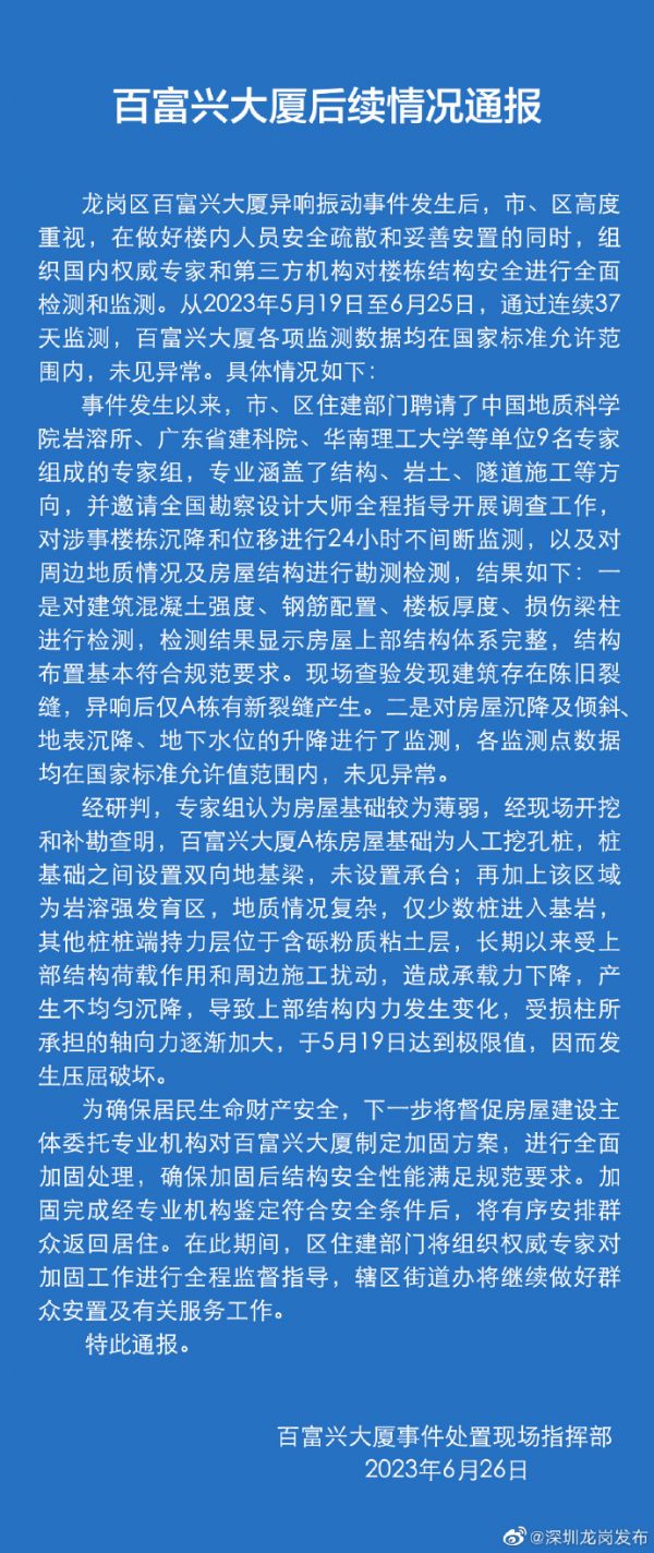6月26日,深圳龙岗发布微博最新消息,百富兴大厦后续情况通报来了: