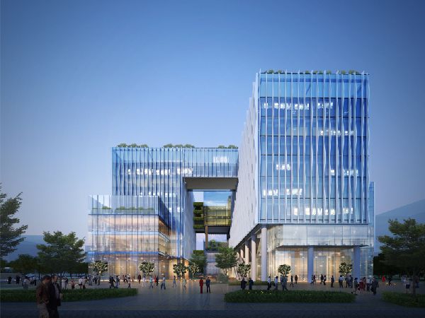 本项目建筑体型简单,三座塔楼(A、B、C区)通过空中连廊连接为一个整体,实现建筑室内空间和机电设备的灵活分区。