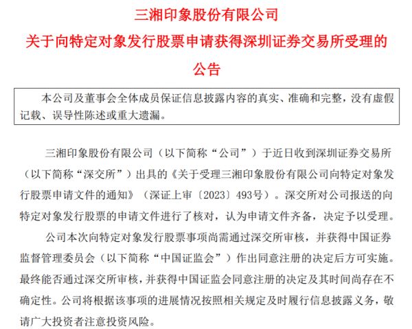 6月29日晚间,三湘印象(000863)(SZ000863,股价3.52元,市值41.56亿元)公告称,近日收到深交所出具的《关于受理三湘印象股份有限公司向特定对象发行股票申请文件的通知》(深证上审〔2023〕493号),对公司报送的向特定对象发行股票的申请文件进行了核对,认为申请文件齐备,决定予以受理。