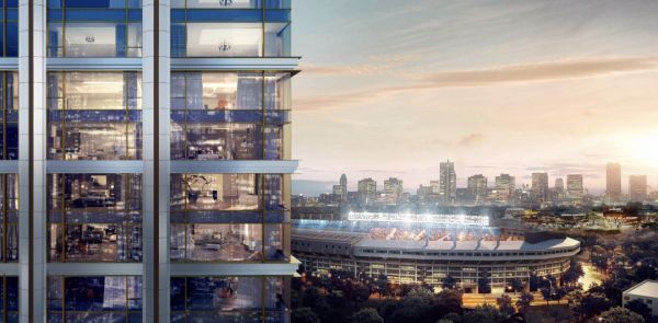 在社交媒体上放出的IN三里看房短视频里,也将“俯瞰工人体育馆”作为一大核心卖点。