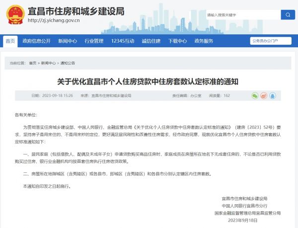 据宜昌市住房和城乡建设局网站消息,9月18日,宜昌市住房和城乡建设局、中国人民银行宜昌市分行、国家金融监督管理总局宜昌监管分局联合发布《关于优化宜昌市个人住房贷款中住房套数认定标准的通知》。内容如下: