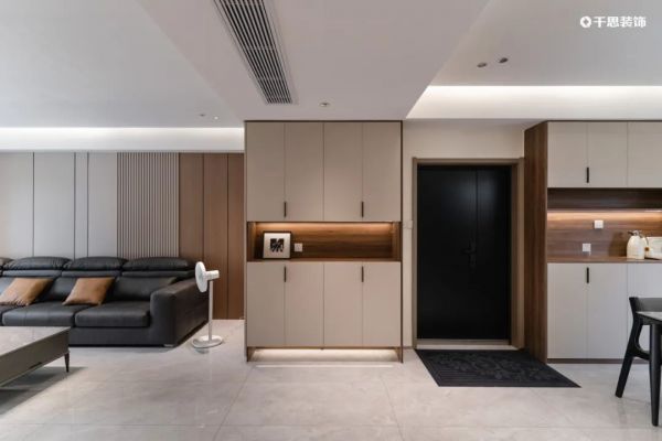 屋主一家五口居住,对新家有着较高的品质要求:比如在空间上,他们希望动静区域划分清晰,动线流畅;在功能上,要有充足的收纳体量;在视觉上,公共区域最好以白色为主,再结合一些黑灰配色以凸显层次和沉稳质感。设计师客餐厅用600x1200的灰色系柔光砖进行通铺,营造仿微水泥的寂效果,搭配无主灯简洁照明,奠定空间的清雅气质,将主卫的干区外移,墙壁内推,留出空间做步入式衣帽间,满足女主人想要的“家庭试衣间”。