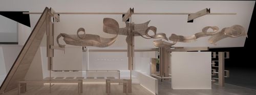 内部展陈   入口的编织隧道,引导观众完成从外界喧嚣到内部宁静的情绪过渡,顶部斜墙延伸至内部,空间由窄至宽,光线由暗渐明。同时,在产品展示上也打破了传统的线性陈列,以“穿梭之径”的概念营造探索感。