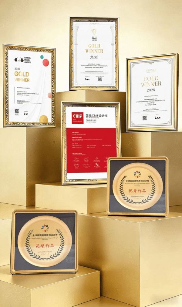 「未见」系列的获奖底气,源于每一项荣誉的行业分量。国际层面,美国MUSE设计奖被誉为“设计界奥斯卡”,伦敦设计奖、法国设计奖同属国际奖项协会(IAA)旗下权威赛事,评审标准覆盖创新性、美学价值、可持续性等全维度,仅授予全球范围内突破行业边界的原创作品;国内层面,国际CMF设计奖聚焦色彩、材料、工艺的深度创新,全球表面装饰原创设计秀则是饰面材料领域的顶尖赛事,双重认可印证了「未见」在行业内的标杆地位。