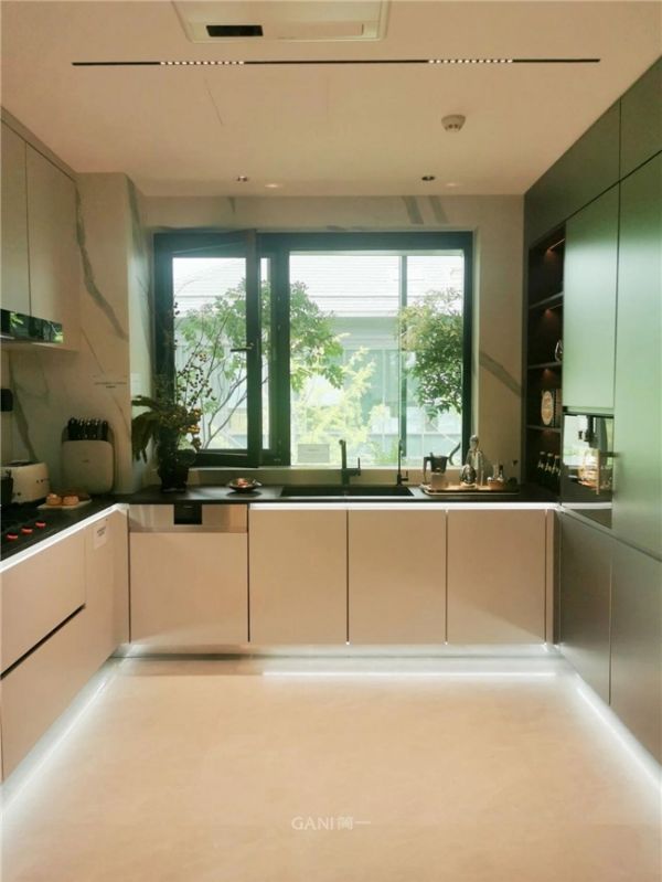 厨房设计以简约为主,经典的黑白搭配(简一经典雪花白✖黑白根),利落且优雅。地面臻选简一皇家白玉大理石瓷砖,完成奢石级铺装。它并非普通的石材纹理,其灵感源自丹麦的珍稀矿脉,纹理如白色天然玛瑙般独特而奢华。米黄与纯白在其中深浅交织、叠合晕染,既彰显了白玉的冰澈纯净,又蕴藏着温润如脂的玉质感。